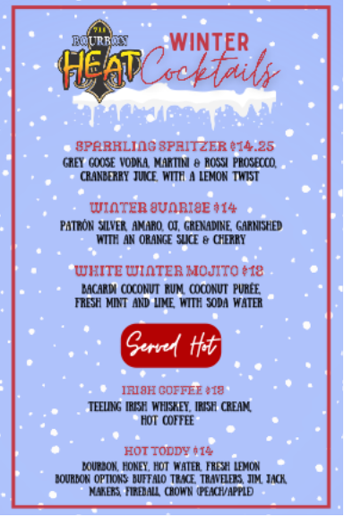 Wanna dance with somebody, as the song goes? Bourbon Heat offers company holiday parties on all days of the week at various time slots. They also fully decorate the entire building for the holiday and offer a specialty winter cocktail menu. Please email Amanda at bourbonheatoffice@gmail.com for more information.